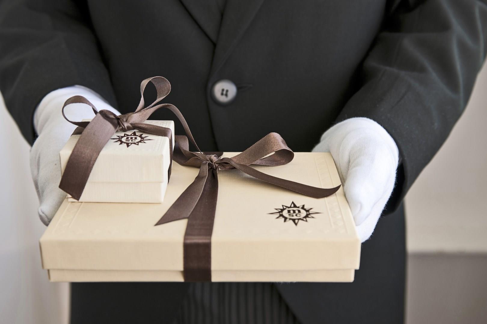 A MSC Yacht Club butler in white gloves serves cruises guests tea and coffee with delicious pastries on a tiered.